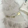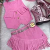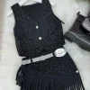 Esse look boiadeira é cheio de estilo e atitude!O conjunto é composto por saia e colete em preto com franjas e aplicações de strass, que trazem brilho e modernidade à produção. Acompanha cinto prateado com fivela estilizada, que dá um toque ainda mais marcante ao visual. Encante-se com esse modelo exclusivo que acompanha chapéu no mesmo estilo, perfeito para compor o look completo da sua pequena! O conjunto traz toda a inspiração do universo Ana Castela, Boiadeira, Blogueira, Blogueirinha, Cowgirls, festas juninas e julinas, sendo uma peça versátil para diferentes ocasiões. Confeccionado em jeans, com corte moderno e cheio de estilo, é um modelo que une conforto e autenticidade. Informações Importantes: O tom do jeans pode variar de acordo com o lote. Medidas podem variar em até 2cm. Calçados vendidos separadamente, disponíveis em nosso site na categoria Calçados. Poderá haver variação de tonalidade do produto dependendo da tela do seu dispositivo. Um look completo, cheio de personalidade, que vai conquistar tanto nas festas temáticas quanto no dia a dia estiloso da sua princesa!