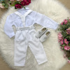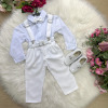 Conjunto Social Infantil Leo – Estilo e Elegância para Momentos Especiais Este conjunto social infantil é a escolha perfeita para deixar os pequenos elegantes e confortáveis em casamentos, batizados, aniversários, formaturas e cerimônias em geral.Com um visual sofisticado e moderno, é ideal para quem busca estilo com praticidade e ótimo caimento. Detalhes do Produto: Camisa social branca de manga longa, confeccionada em microfibra 100% poliéster, com toque macio, leve e confortável; Calça branco em twill 100% poliéster, com corte reto e caimento elegante; Gravata borboleta branco, combinando com o tom da calça; Suspensório branco com regulagem ajustável; Cinto branco com fivela metálica, ajustável. Atenção: Calçados e demais acessórios vendidos separadamente; Produto delicado: recomendamos lavagem à mão com sabão neutro; Tonalidade pode variar de acordo com o lote; As medidas podem variar em até 2cm. Recomendamos sempre consultar a tabela de medidas antes da compra para evitar erros. As cores do produto podem sofrer variações de tonalidade conforme a configuração da tela do seu dispositivo.