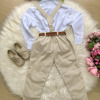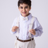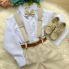 Conjunto Social Infantil Vitor – Estilo e Elegância para Momentos Especiais Este conjunto social infantil é a escolha perfeita para deixar os pequenos elegantes e confortáveis em casamentos, batizados, aniversários, formaturas e cerimônias em geral.Com um visual sofisticado e moderno, é ideal para quem busca estilo com praticidade e ótimo caimento. Detalhes do Produto:   Camisa social branca de manga longa, confeccionada em microfibra 100% poliéster, com toque macio, leve e confortável; Calça linho em 70% poliester, 16% viscose, 11% linho, 3% algodão, com corte reto e caimento elegante; Gravata borboleta linho, combinando com o tom da calça; Suspensório linho com regulagem ajustável; Cinto marrom com fivela metálica, ajustável. Atenção:   Calçados e demais acessórios vendidos separadamente; Produto delicado: recomendamos lavagem à mão com sabão neutro; Tonalidade pode variar de acordo com o lote; As medidas podem variar em até 2cm. Recomendamos sempre consultar a tabela de medidas antes da compra para evitar erros. As cores do produto podem sofrer variações de tonalidade conforme a configuração da tela do seu dispositivo.
