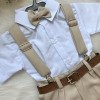 Este conjunto social infantil é a escolha perfeita para deixar os pequenos elegantes e confortáveis em eventos como casamentos, batizados, aniversários, formaturas e cerimônias em geral. Com um visual sofisticado, ele é ideal para quem busca estilo com praticidade. Detalhes do Produto: Camisa social branca de manga curta, confeccionada em microfibra 100% poliéster, com toque macio e caimento leve. Short preto em twill 100% poliéster, com acabamento moderno na barra dobrada. Acompanha gravata borboleta bege, suspensório bege com regulagem e cinto ajustável marrom com fivela metálica. Itens Inclusos:CamisaShortGravata borboletaSuspensórioCinto Calçado não incluso – vendido separadamente. Disponivel em nosso site na categoria calçados meninosAs tonalidades das peças podem variar de acordo com as configurações de tela do seu dispositivo.Para garantir o ajuste ideal, consulte sempre a nossa tabela de medidas antes de finalizar a compra. As medidas podem apresentar pequenas variações conforme o lote de fabricação.