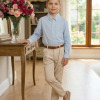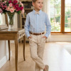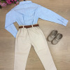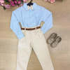 Conjunto Social Henrique – Elegância Clássica Um conjunto sofisticado e moderno, perfeito para ocasiões especiais. A combinação da camisa com a calça social cria um visual elegante, ideal para deixar os pequenos ainda mais estilosos em eventos importantes. Perfeito para casamentos, aniversários, batizados, formaturas e ensaios fotográficos. Detalhes do Conjunto • Camisa social azul de manga longa • Estampa listrada delicada, trazendo um visual clássico e sofisticado • Gola social estruturada • Fechamento frontal por botões • Punhos com botões, permitindo melhor ajuste nas mangas • Tecido leve e confortável • Calça social bege • Modelagem elegante com pregas frontais • Corte moderno que garante bom caimento • Cintura com passantes para uso de cinto • Cinto marrom • Acessório clássico que complementa o visual • Gravata borboleta bege •Detalhe sofisticado que completa o look social Destaques do Look • Visual clássico e elegante • Combinação de cores sofisticadas e versáteis • Ideal para eventos especiais e fotos marcantes Informações Importantes • Calçados não acompanha o produto • Tecido camisa 100% algodão/ calça oxford 100% poliester • Acessórios das fotos são ilustrativos • As cores podem variar conforme a tela do dispositivo • As medidas podem variar em até 2cm