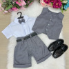 TECIDO: CAMISA BRANCA MICROFIBRA 100% POLIESTERTECIDO DO SHORTS TWILL COLORIDO 100% POLIESTER   Conjunto composto por: Camisa social na cor Branca, gravata borboleta CINZA shorts na cor CINZA, Colete CINZA e Cinto PRETO Demais peças ou acessórios, não inclusos. Calçados Vendindos Separadamente  * LEMBRANDO QUE PODERA HAVER VARIAÇÃO DE TONALIDADE DO PRODUTO DEPENDENDO DA TELA DO SEU DISPOSITIVO
