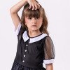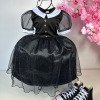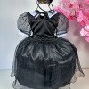 Fantasia Infantil Vandinha – Wandinha Apresentamos a Fantasia Infantil Wandinha, um modelo inspirado no estilo marcante da personagem mais querida da Família Addams. Esse vestido longo traz a essência gótica em uma versão delicada e sofisticada para as pequenas fashionistas.        Detalhes do Produto Vestido preto com saia longa em tule leve e brilho sutil; Parte superior com gola branca clássica e botões frontais, remetendo ao estilo original da Vandinha; Mangas em tule transparente com acabamento moderno; Modelagem confortável que garante liberdade de movimentos.Informações Importante As medidas podem variar em até 2cm. Recomendamos sempre consultar a tabela de medidas antes da compra para evitar erros. Cuidado ao vestir: não forçar a entrada ou puxar o tecido, pois pode esgarçar a costura ➝ Não realizaremos troca por mau uso. Tiara e outros acessórios não acompanham o produto, mas estão disponíveis em nosso site. Calçado vendido separadamente, disponível na categoria Calçados. As cores do produto podem sofrer variações de tonalidade conforme a configuração da tela do seu dispositivo.